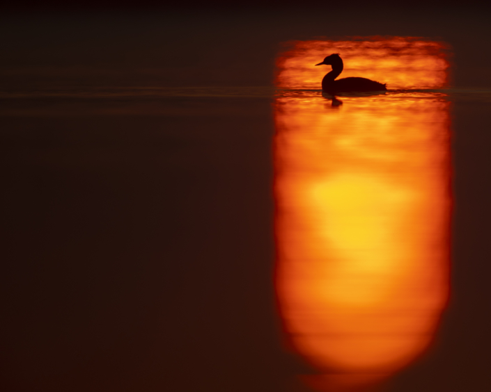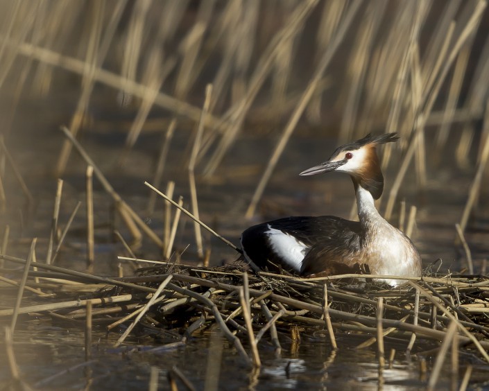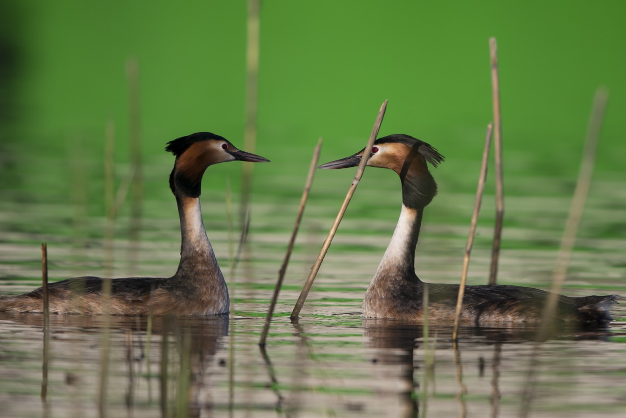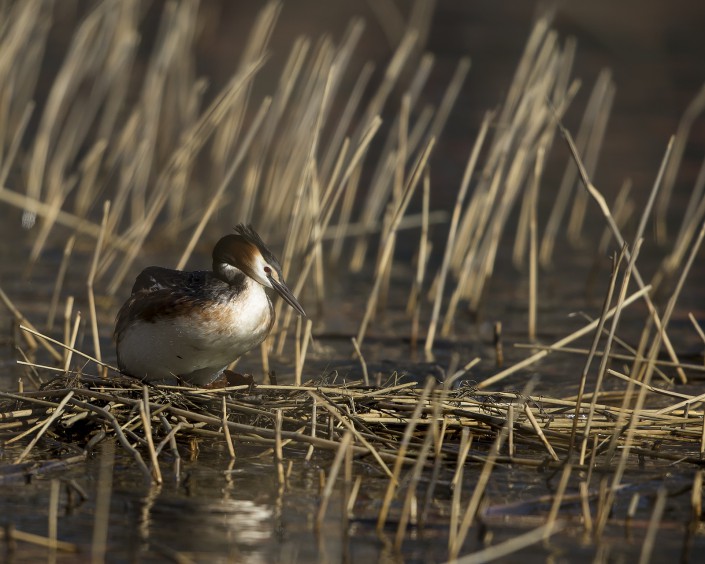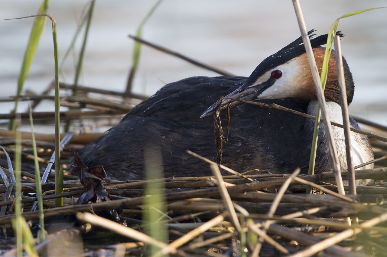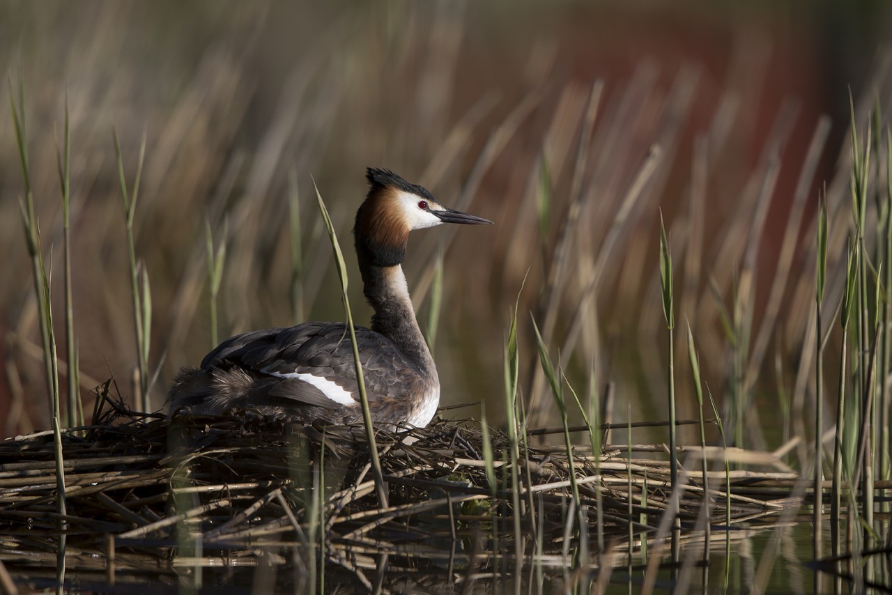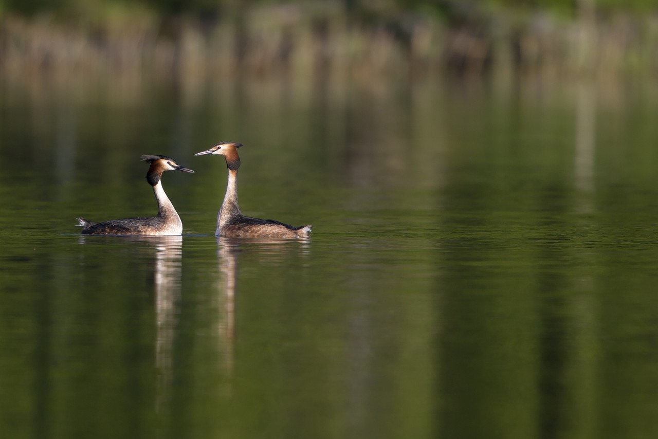 The great crested grebe is the largest member of the grebe family found in the Old World, with some larger species residing in the Americas. They measure 46–51 cm (18–20 in) long with a 59–73 cm (23–29 in) wingspan and weigh 0.9 to 1.5 kg (2.0 to 3.3 lb). It is an excellent swimmer and diver, and pursues its fish prey underwater. The adults are unmistakable in summer with head and neck decorations. In winter, this is whiter than most grebes, with white above the eye, and a pink bill. Unusually, young grebes are capable of swimming and diving almost at hatching. The adults teach these skills to their young by carrying them on their back and diving, leaving the chicks to float on the surface; they then re-emerge a few feet away so that the chicks may swim back onto them.