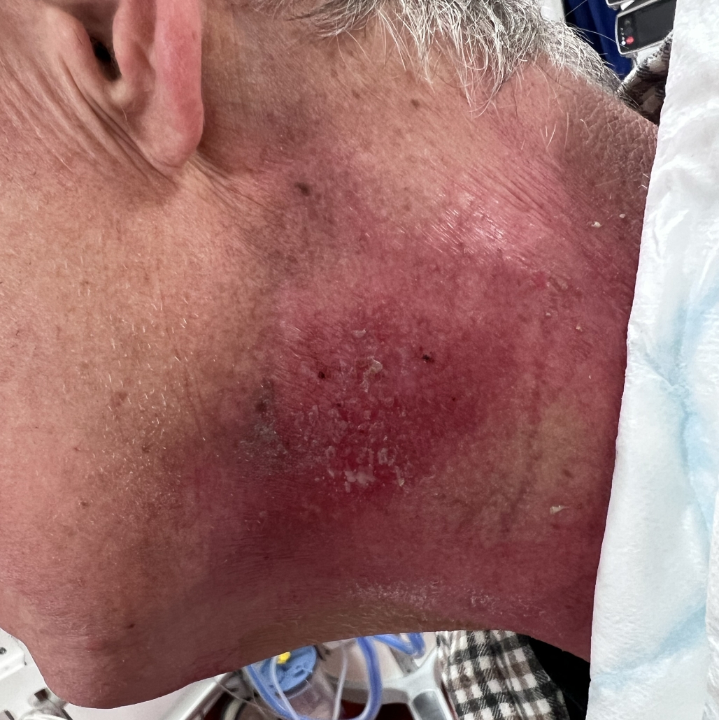 Mina strålskador utanpå halsen har i alla fall börjat läka fint. ASIH har hjälpt mig att lägga om såren några gånger, men till slut kände jag att det fungerade bättre att låta det torka och smörja med mjukgörande kräm.