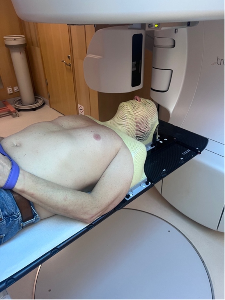 Idag gjorde jag ett besök på strålningsavdelningen. Jag fick gjuta en mask av plast som anpassar sig efter mitt ansikte. Anledningen är att huvudet ska ligga exakt på samma sätt för att fotonerna (stålningen) ska träffa där de ska göra verkan. När den var klar körde de en magnetröntgen med kontrast med masken på för att de sen ska kunna beräkna strålningsdoser efter rätt förutsättningar. Detta är det sista som händer på ett par veckor medan de planerar mitt strålningsschema.